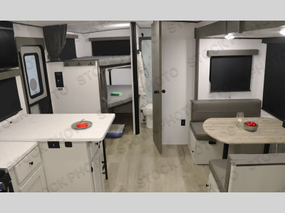 Bring the whole gang along for fun camping trips in this spacious trailer! There are double-size bunks in the back for little ones or your guests, and the full bath is right next to the bunks for easy nighttime use. You'll enjoy the front private bedroom with a queen bed all to yourselves, plus there is under bed storage and dual wardrobes to keep your clothes tidy. Everyone will love to meet in the main living area that includes a large slide out for more space, a booth dinette, plus an entertainment center with TV prep. The chef of your group will have a U-shaped kitchen area that includes a bar top with two stools, plus there is an outside kitchen with a griddle and mini fridge when the weather is nice out!