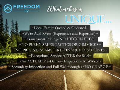 Freedom RV Texas is not responsible for any misprints, typos, or errors found in our website pages. Any price listed excludes sales tax and registration fees. Manufacturer pictures, specifications, and features may be used in place of actual units on our lot. Please contact us @903-200-8426 for availability as our inventory changes rapidly. All calculated payments are an estimate only and do not constitute a commitment that financing or a specific interest rate or term is available.