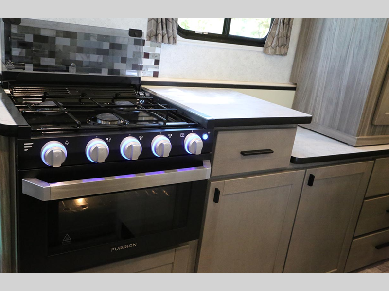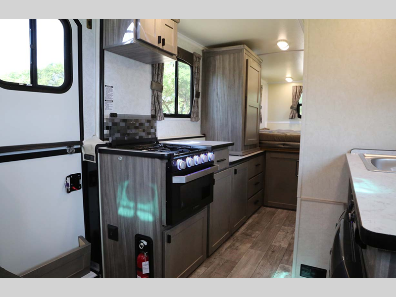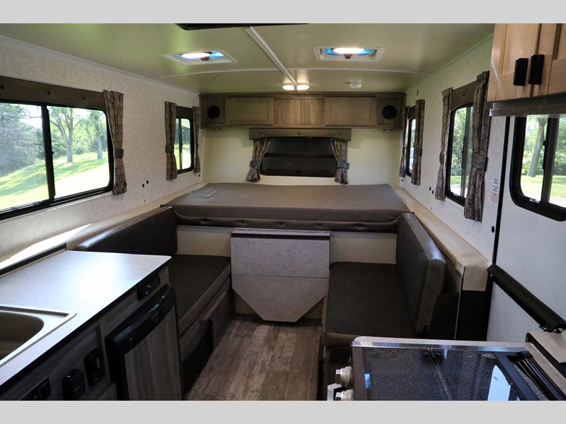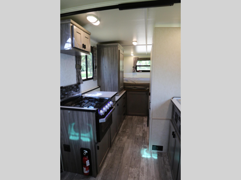 Each travel trailer features rubber torsion axles with independent suspension and a bearing lubrication system for smooth towing and setup. The durable metal underbelly, the 3" laminated floor, and the 2" x 5" steel frame will allow you to enjoy your trailer for years to come. Some of the exterior conveniences you will enjoy having are four stabilizer jacks, an outside shower, and an outside porch light for when you come inside in the evening. On the inside, you are sure to love the marble-look countertops, a three burner stove with oven, a Fantastic vent ceiling fan, and a Suburban 20,000 BTU furnace to keep you warm during the cooler camping months.