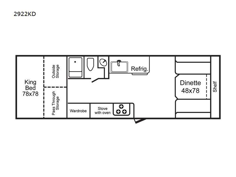 Sleeps 4 Slides 1 Length 22 ft Ext Width 7 ft 11 in Ext Height 6 ft 8 in Int Height 6 ft 4 in Hitch Weight 434 lbs Dry Weight 3130 lbs Cargo Capacity 1594 lbs Fresh Water Capacity 20 gals Grey Water Capacity 35 gals Tire Size 15" Furnace BTU 20000 btu Available Beds King Refrigerator Type Three Way Refrigerator Size 3 cu ft Cooktop Burners 3 LP Tank Capacity 20 lbs Water Heater Capacity 6 gal Water Heater Type DSI Gas/Electric Axle Count 1 Number of LP Tanks 2 Shower Type Tub/Shower Combo Similar Floorplans